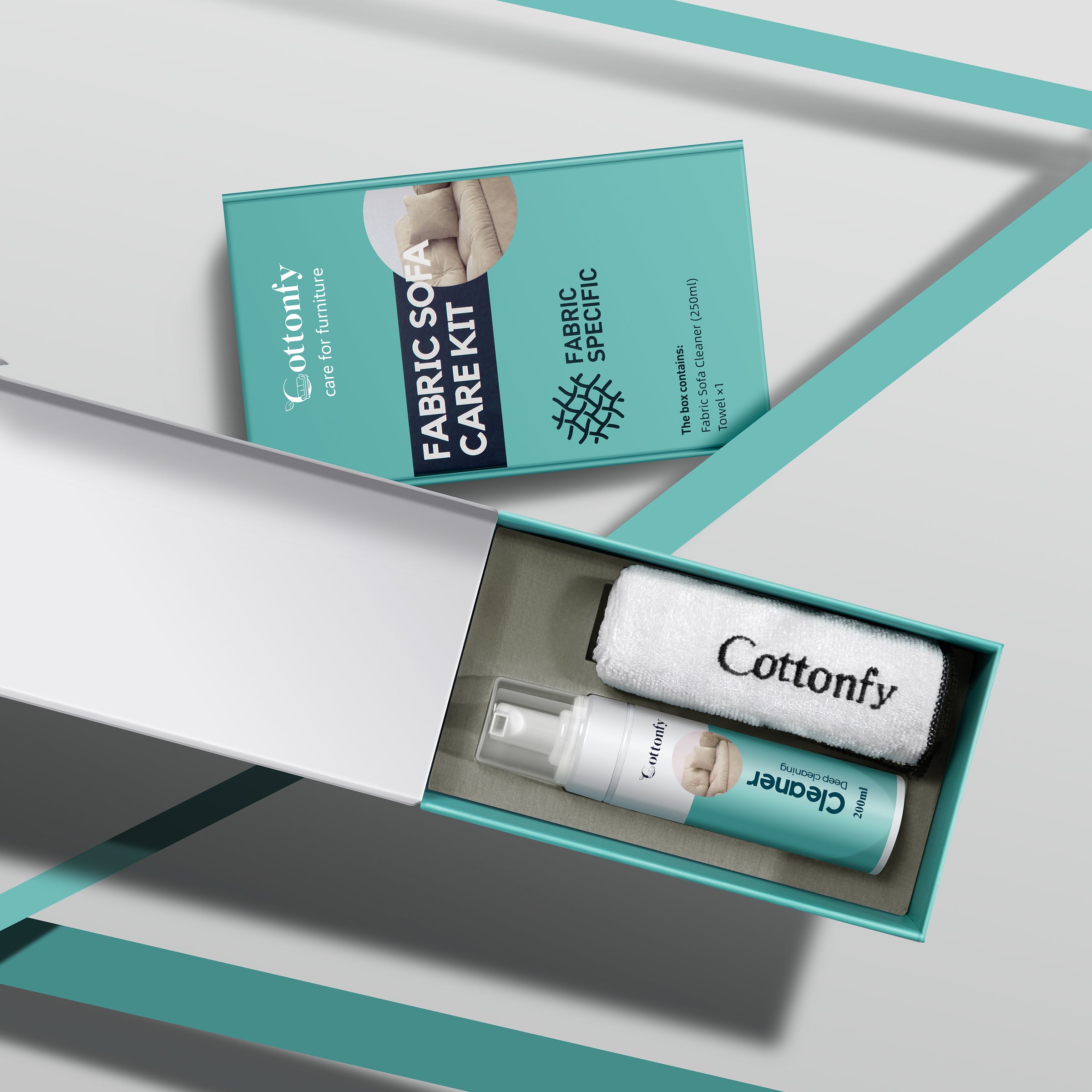 ● For spills or marks, use the Cottonfy Fabric Cleaner with a clean, soft cloth, gently blotting the area rather than rubbing.