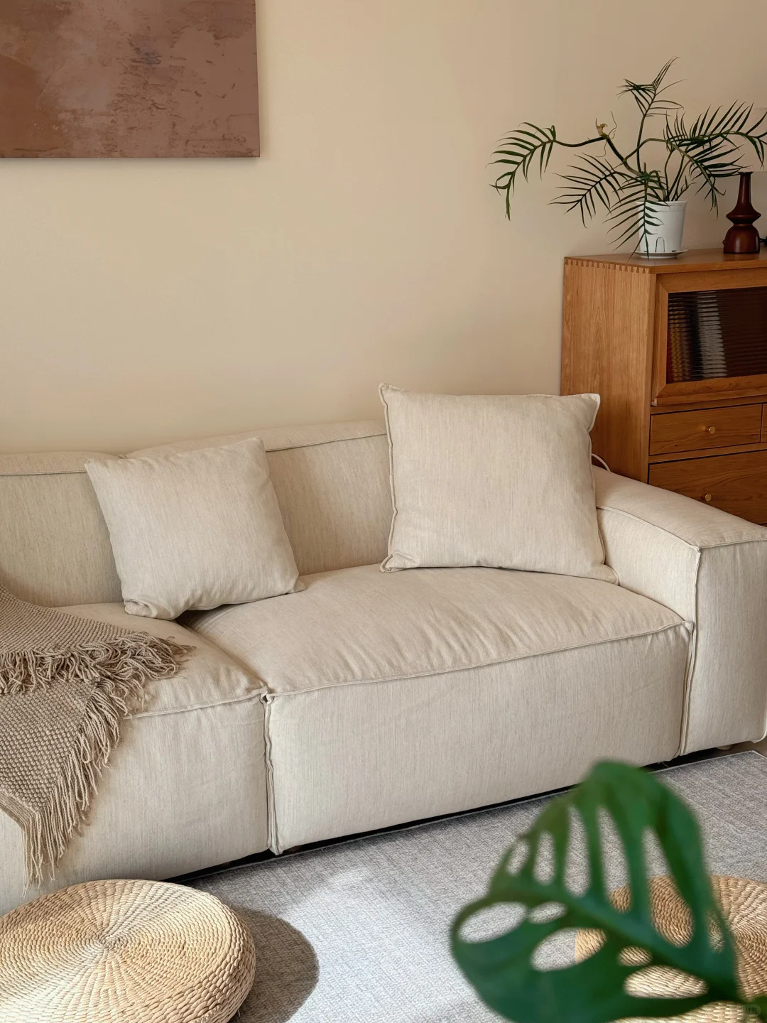 Q3: Does the fabric withstand daily use? A: We use a premium cotton-linen blend that is not only soft but also durable. It gives the textured look of a boucle sofa but with the breathability of natural linen. It's designed to maintain its "cream" elegance with easy care.