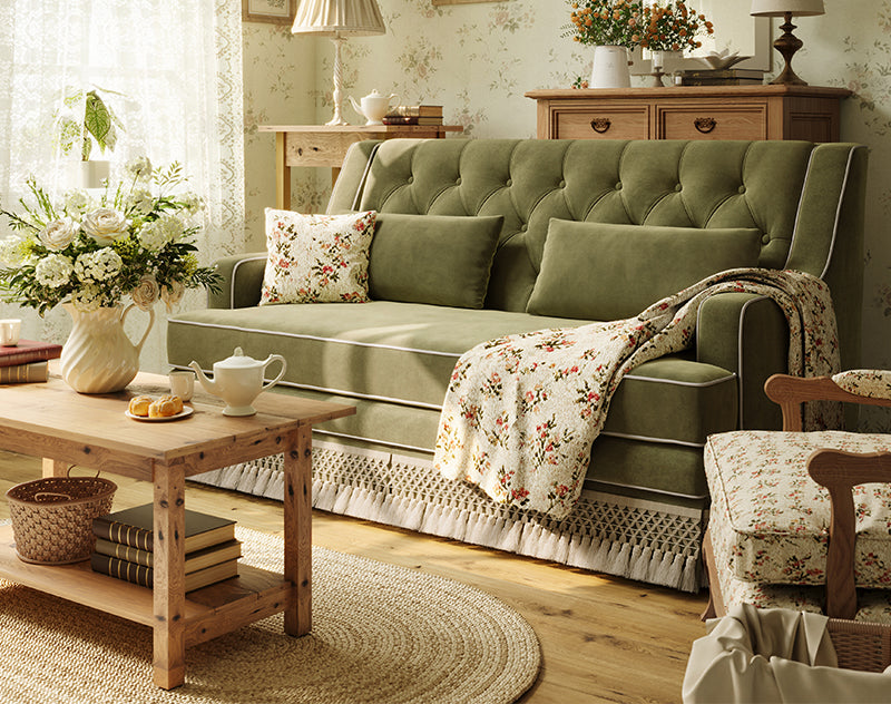 A: The sofa is upholstered in eco-friendly velvet fabric that has a frosted matte texture. It's durable, scratch-resistant, and easy to maintain, making it perfect for everyday use in busy households.