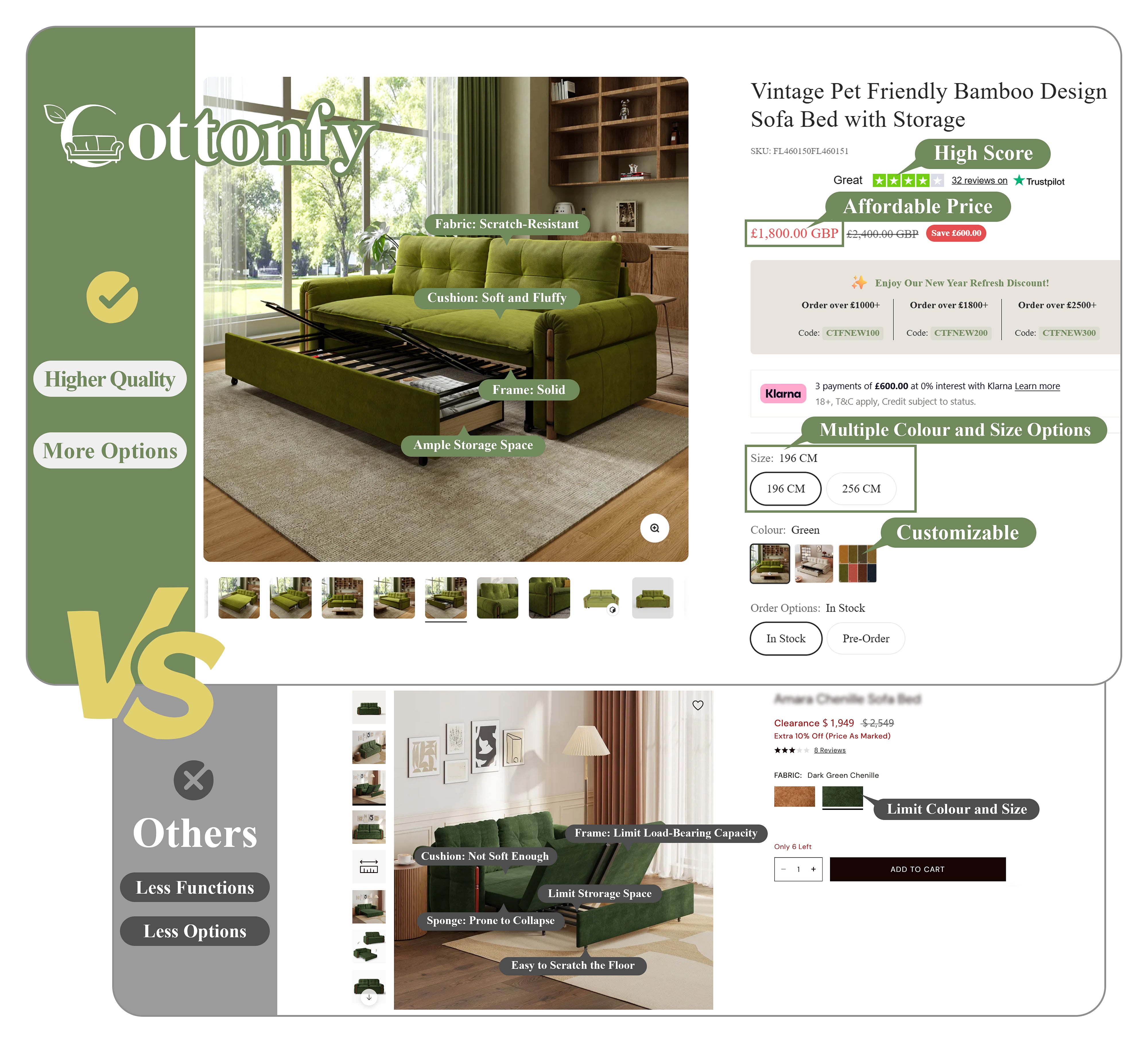 A: Unlike standard models, this bamboo-inspired sofa bed combines a natural aesthetic with premium materials, plus a pull out design, storage, and pet-friendly features.